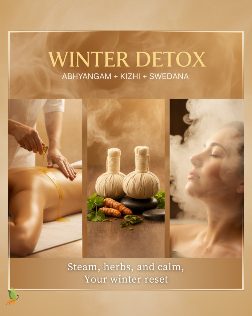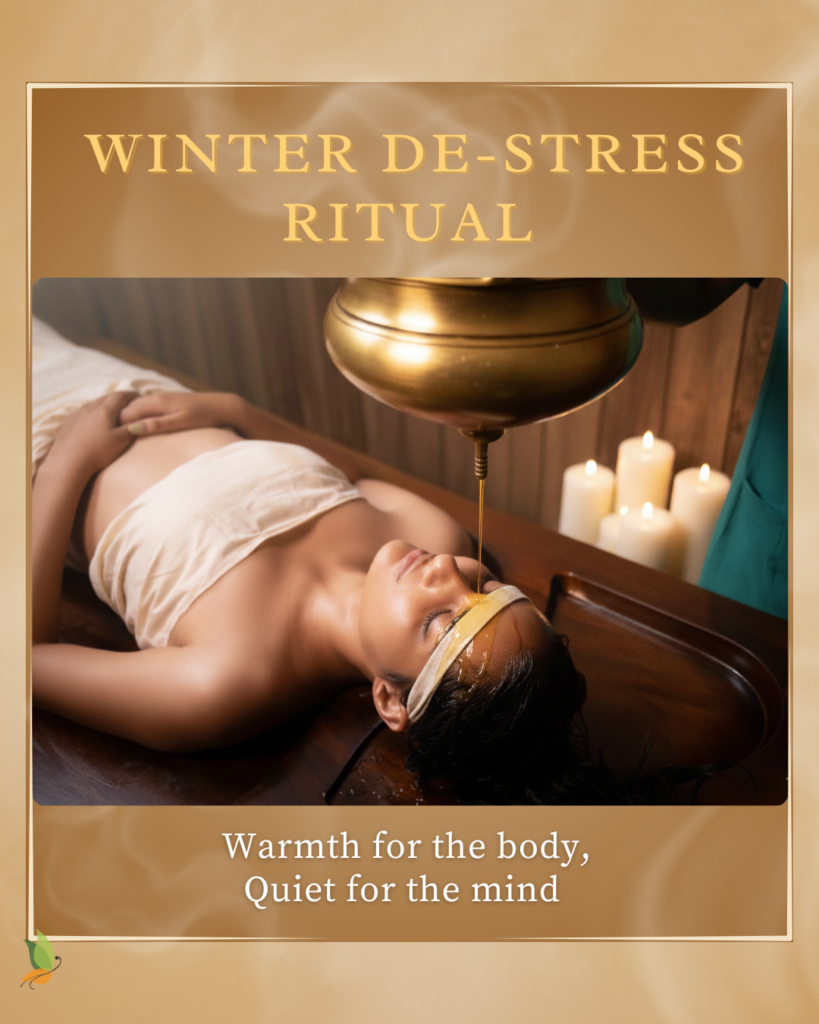 Winter De-Stress: A 90-Minute Calmness Ritual Winter De-Stress: A 90-Minute Calmness Ritual Warmth for the body, calm for the mind. Warmth for the body, calm for the mind. Why Winter De-Stress Cold weather, shorter days, and holiday pressure make the mind sensitive.This 90-minute experience is designed to bring mental clarity and deep calm. What’s Inside the Experience Abhyangam — Warm Oil Massage Helps reset the body’s nervous system through soothing touch. Kizhi — Herbal Bolus Therapy Loosens stiffness and encourages relaxation in deeper muscle layers.Shirodhara — Warm Oil Flow to the Forehead A steady stream of warm oil to relax the mind and promote emotional balance. What’s Inside the Experience Abhyangam — Warm Oil Massage Helps reset the body’s nervous system through soothing touch. Kizhi — Herbal Bolus Therapy Loosens stiffness and encourages relaxation in deeper muscle layers.Shirodhara — Warm Oil Flow to the Forehead A steady stream of warm oil to relax the mind and promote emotional balance. Who It’s For What You Feel After Stillness. Warmth. Clarity. Emotional ease. Book Your Winter De-Stress Session